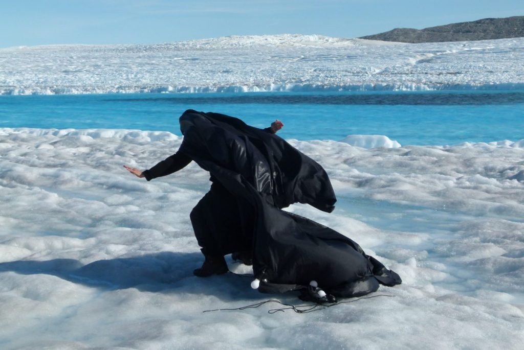 Image: Jessie Kleemann, Arkhtikós Doloros, 2019. Performed for “At the Moraine: Envisioning the Concerns of Ice” workshop on June 19, 2019. Filmed by Chelsea Reid.